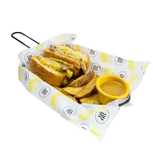 A juicy quarter-pounder beef patty stacked with cheese, fresh veggies, and crisp lettuce on toasted wheat buns—served with golden potato wedges and our signature mayo dip.