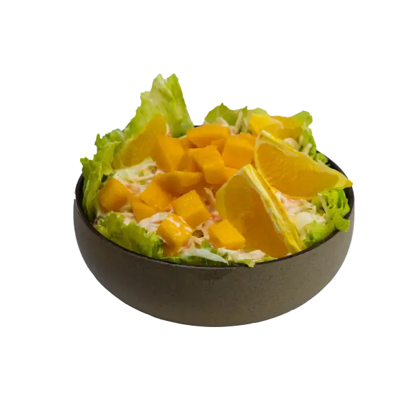 A refreshing mix of crisp greens, fresh orange and mango slices, and kani sticks in a creamy mayo-based dressing—light, vibrant, and full of crunch.